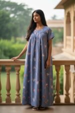 This printed Blue Grey nightgown provide comfort for both sleeping and lounging, featuring designs with prints and are known for lasting well after washing.